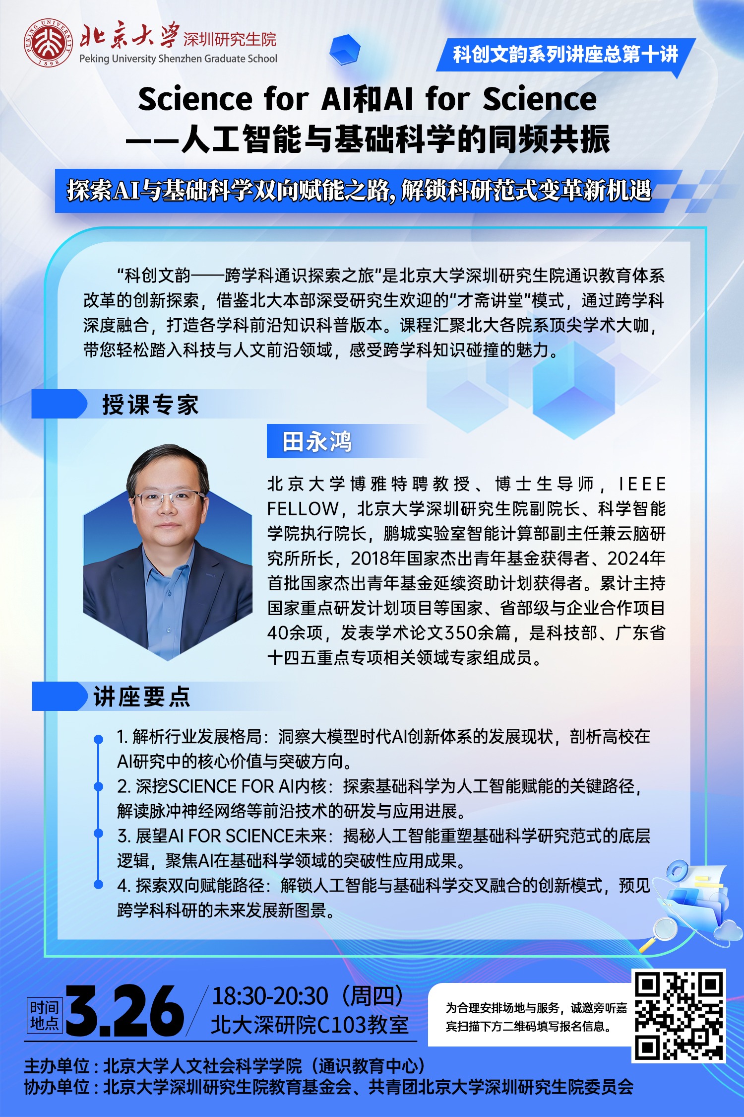 3月26日:Science for AI和AI for Science——人工智能与基础科学的同频共振 2026年3月26日(星期四)18:30—20:30