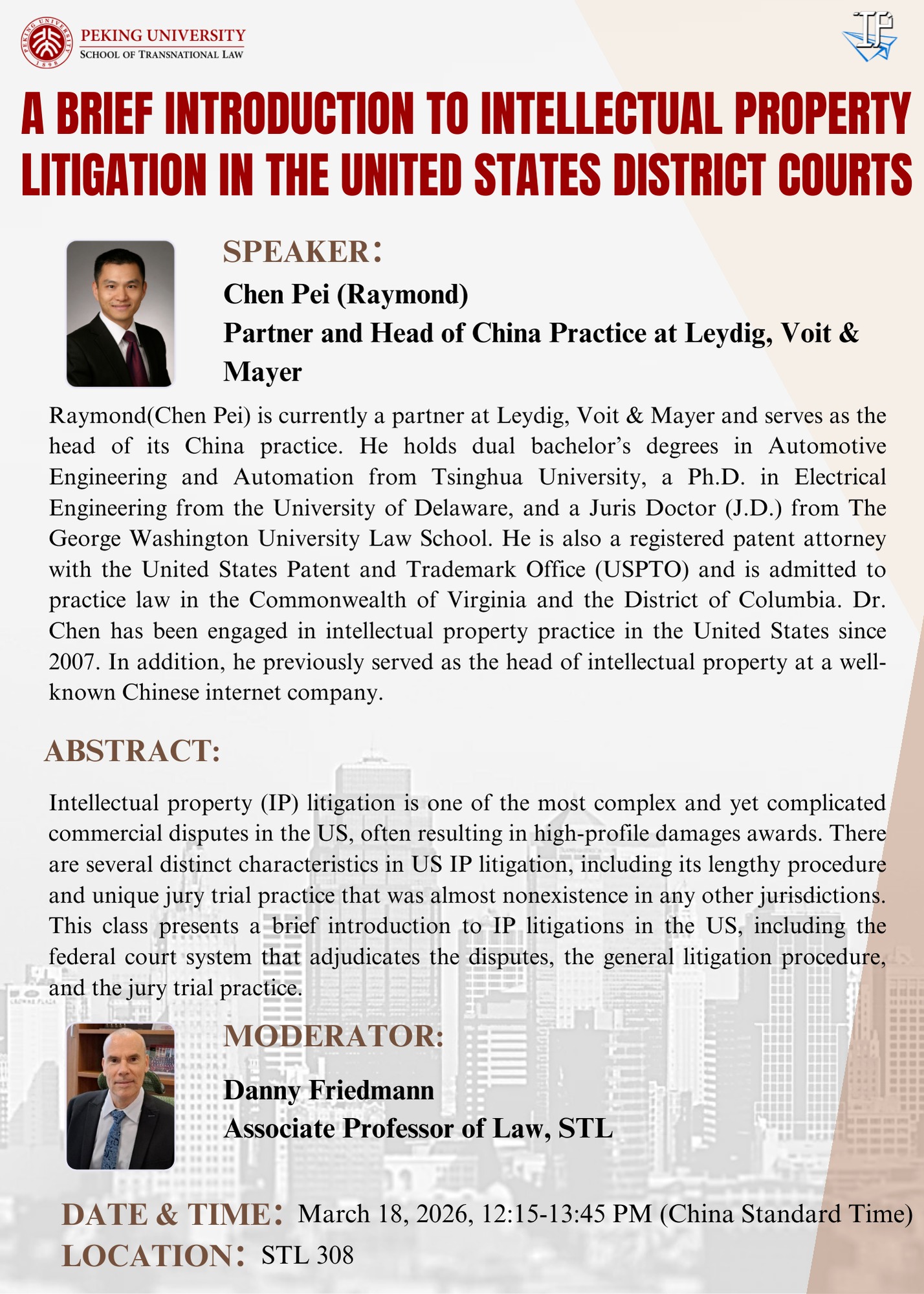 3月18日:美国联邦地区法院知识产权诉讼简介 2026年3月18日(星期三)12:15-13:45